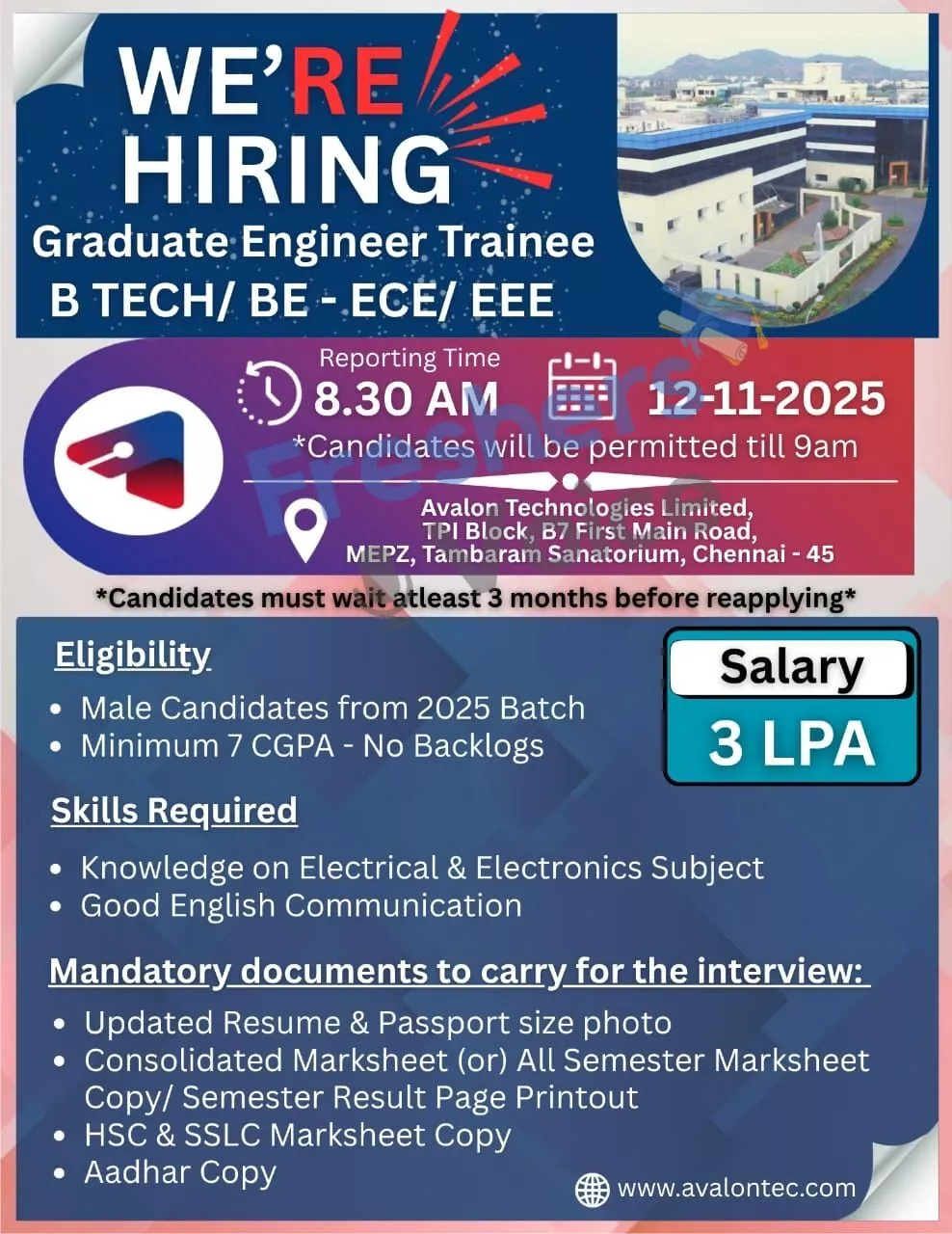 Avalon Technologies Walk-in Drive 2025: Avalon Technologies Ltd is scheduled to hire Graduate Engineer Trainees for B.E/B.Tech graduates. Candidates looking for jobs in Chennai can utilise this opportunity. Interested and eligible candidates can attend the Walk-in drive on 12 November 2025. The details of eligibility and venue are given below. Interested candidates can also try Wipro Walk-In Drive.