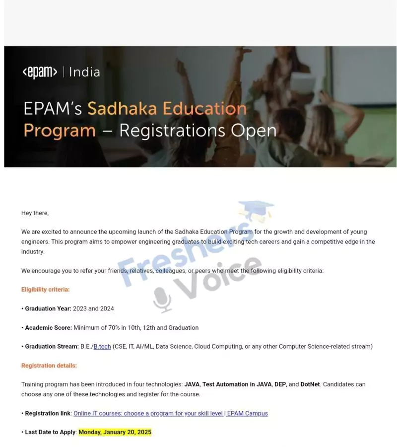 EPAM’s Sadhaka Education Program 2025: EPAM has announced the Sadhaka Education Program for the growth and development of young ‘engineers. This program aims to empower engineering graduates to build exciting tech careers and gain a competitive edge in the industry. This Training program has been introduced in four technologies: JAVA, Test Automation in JAVA, DEP, and DotNet. Candidates can choose any one of these technologies and register for the course. EPAM’s online self-paced learning program is designed to empower engineering graduates to take control of their professional journey. This comprehensive learning program equips you with the most sought-after skills in testing, giving you a head-start in your career. Please read this information carefully before registering and ensure that you meet all the requirements.