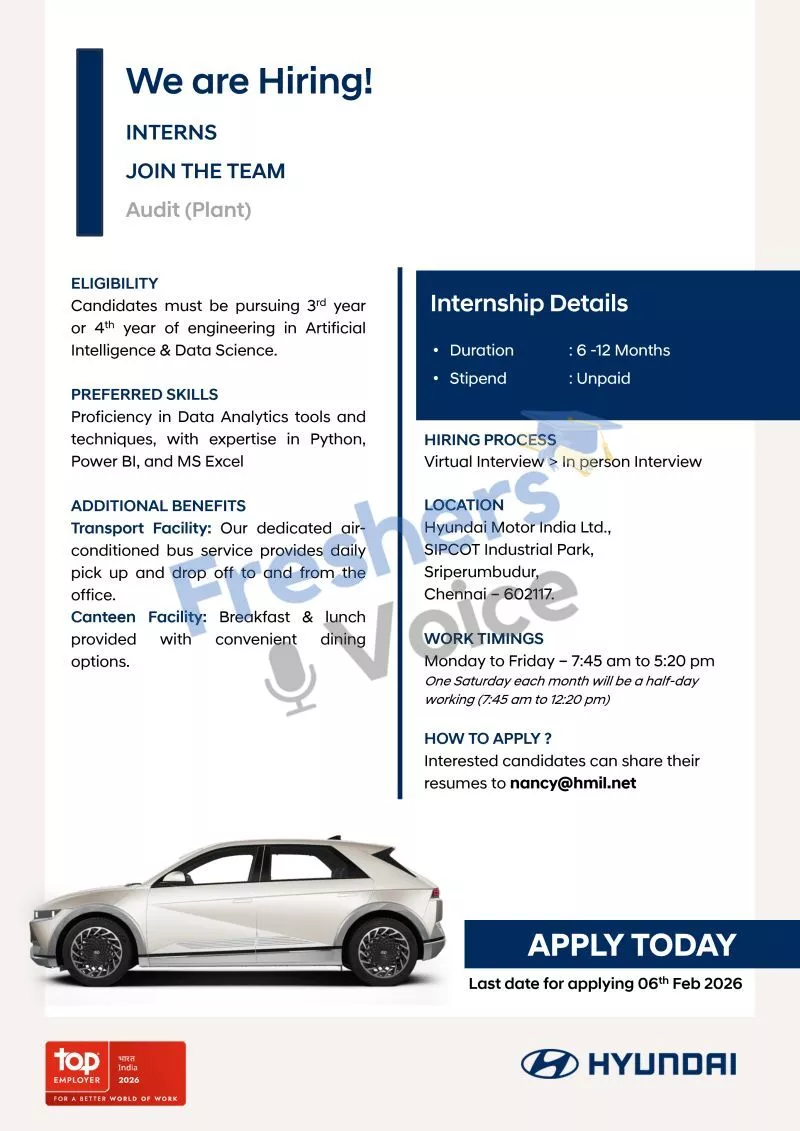 Hyundai Internship 2026: Hyundai is scheduled to hire AI & Data Science Interns for B.E/B.Tech qualifications. Candidates looking for jobs in Chennai can utilize this opportunity. Interested and eligible candidates can apply through email ID on or before 06 February 2026. The detailed eligibility and application process are given below. Interested candidates can also try the IBM Internship.