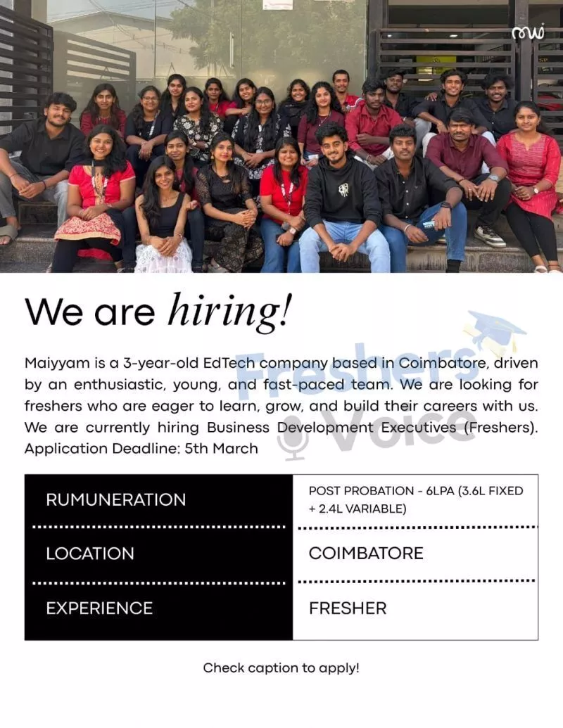 Job Description:ย Maiyyam is a 3-year-old EdTech company based in Coimbatore, driven oy an enthusiastic, young, and fast-paced team. We are looking for reshers who are eager to learn, grow, and build their careers with us. We are currently hiring Business Development Executives (Freshers).